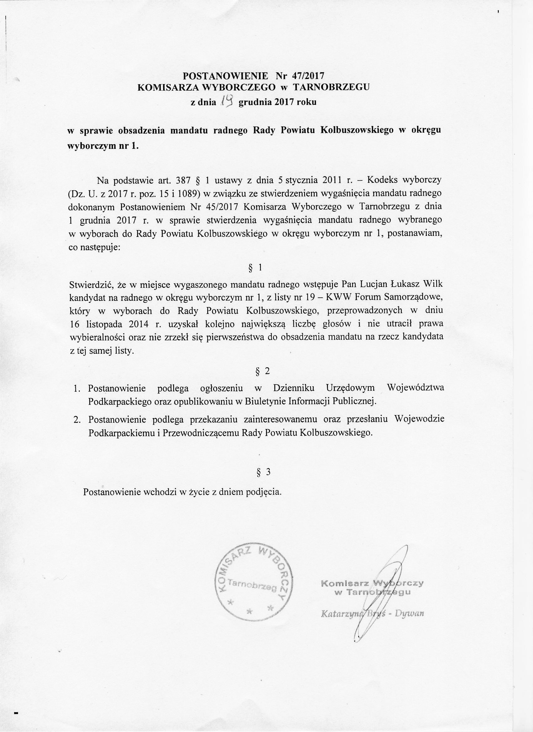w sprawie obsadzenia mandatu radnego Rady Powiatu Kolbuszowskiego w okręgu wyborczym nr 1.