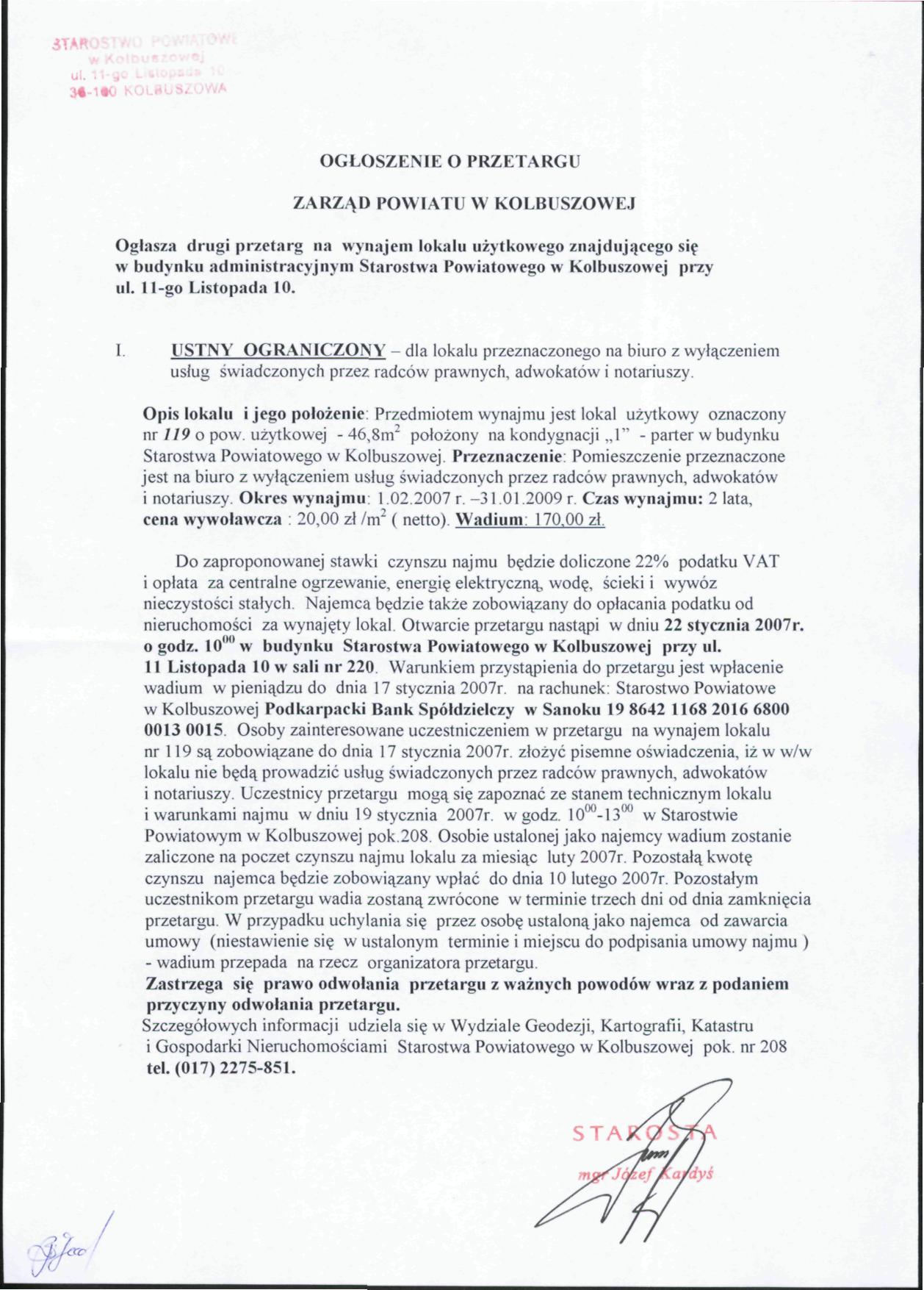 Zarząd Powiatu w Kolbuszowej ogłasza drugi przetarg na wynajem lokalu użytkowego znajdującego się w budynku administracyjnym Starostwa Powiatowego w Kolbuszowej przy ul. 11-go Listopada 10.