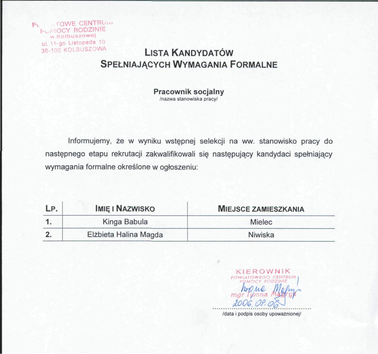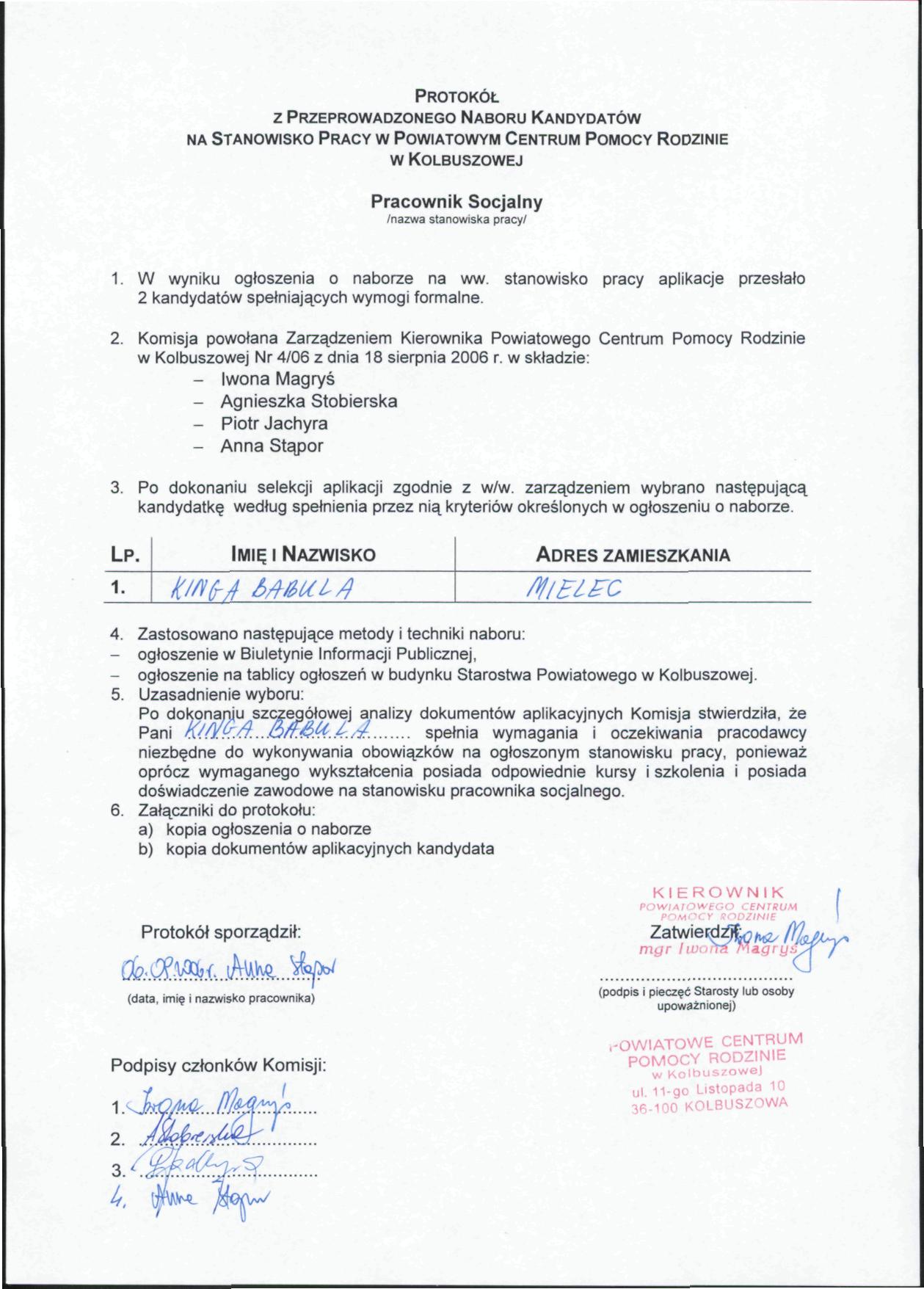 Dokumenty należy składać w terminie do: 01 września 2006 r. do godz. 1000 w sekretariacie Starostwa Powiatowego w Kolbuszowej z dopiskiem „NABÓR NA STANOWISKO PRACY – PRACOWNIK SOCJALNY ”
