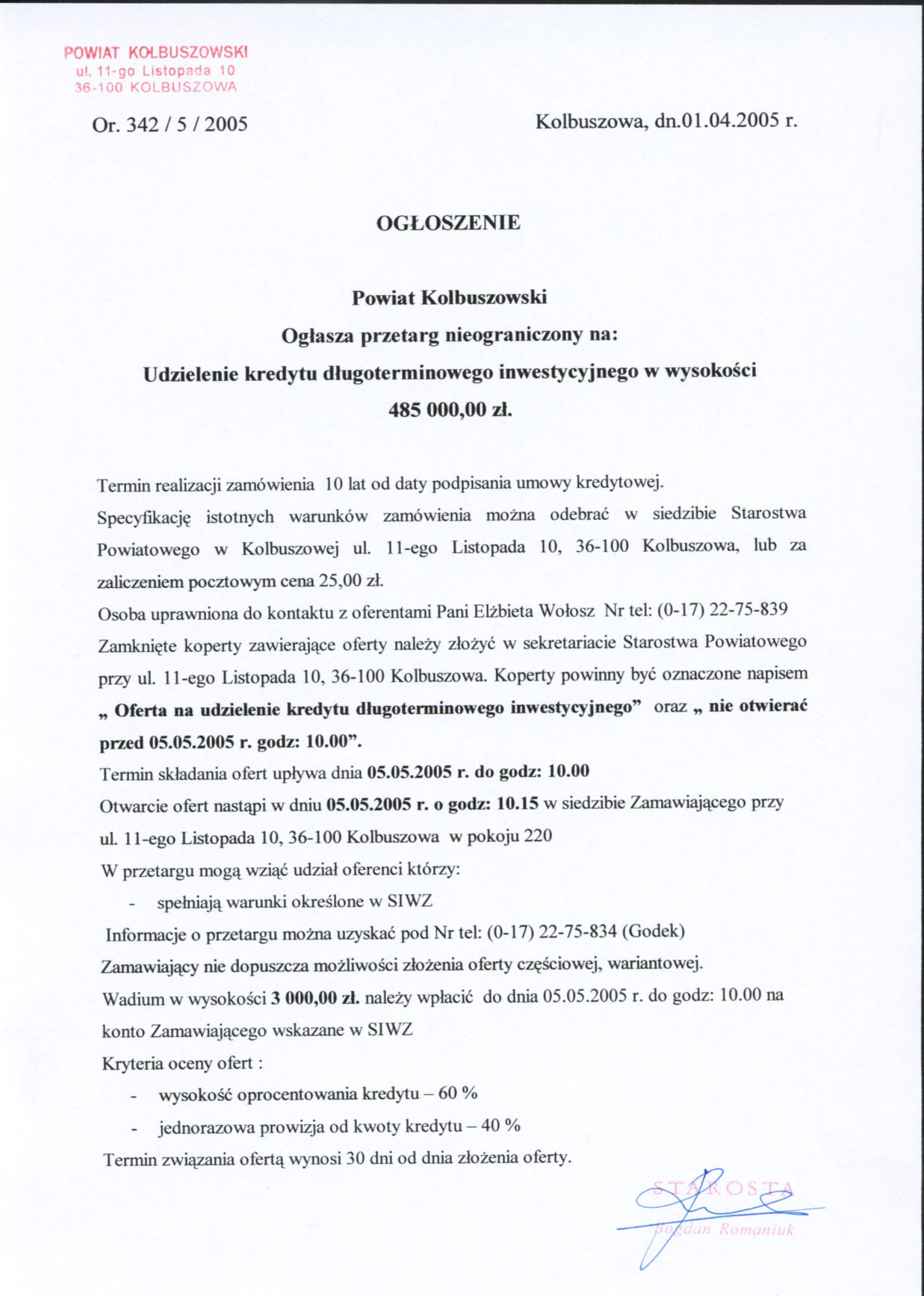 Powiat Kolbuszowski ogłasza przetarg nieograniczony na: udzielenie kredytu długoterminowego inwestycyjnego w wysokości 485 000,00 zł.